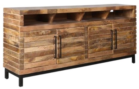 This console blends beauty and function, featuring a hand-applied matte Amber finish that highlights natural Mango wood. Its iron base adds modern industrial flair, while four doors, open compartments, and cord management provide practical storage. Distinctive hardware completes its elegant, sophisticated look.Read More